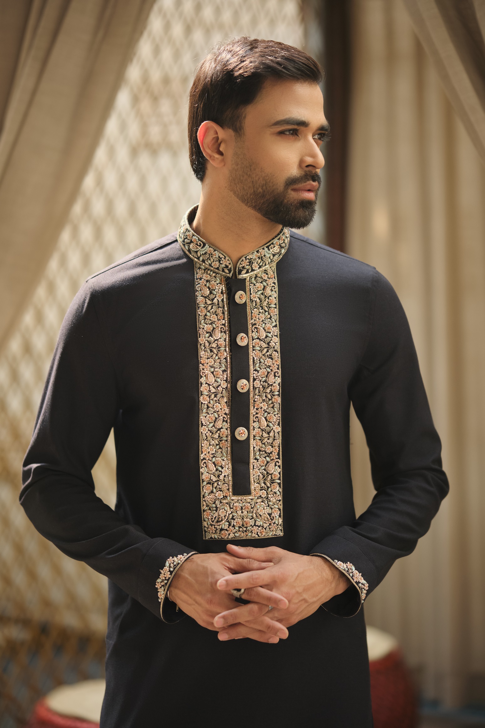 Fabric color : Ash black, all over heavy sequins hand work, antique zardosi in collar placket and button, hand stich on sleeve.