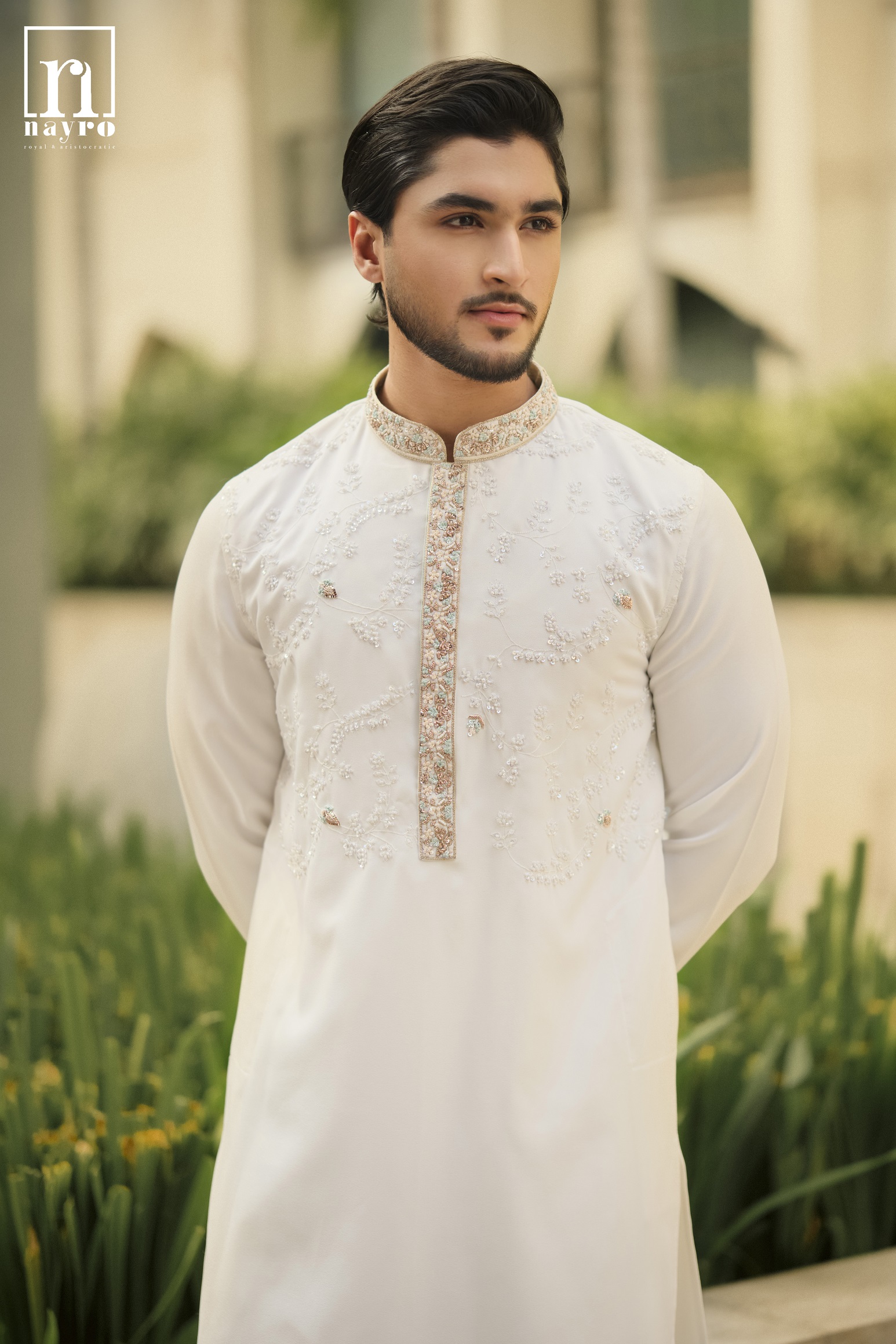 Fabric Black, diamond motif zardosi in collar, body & sleeve with metal button.