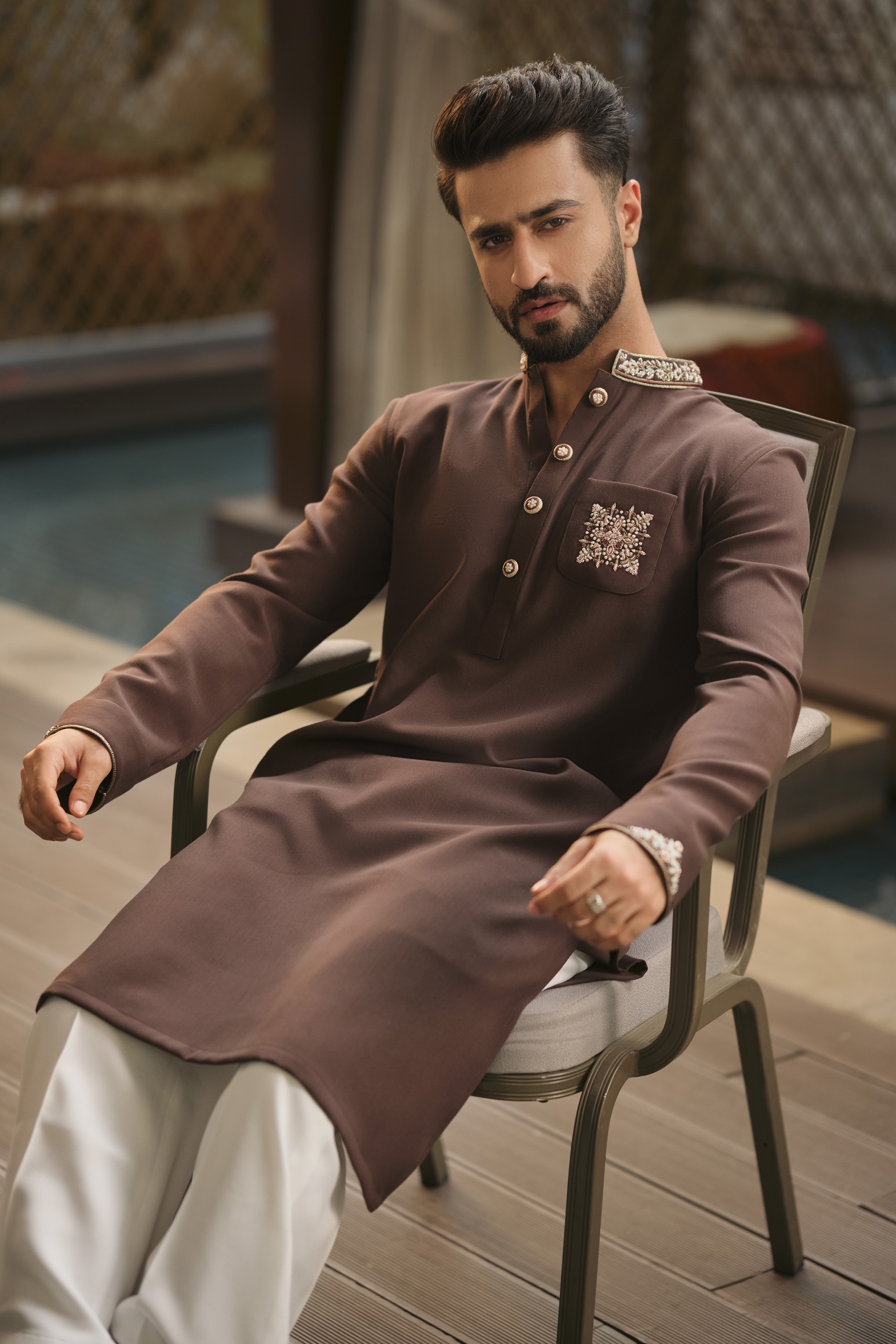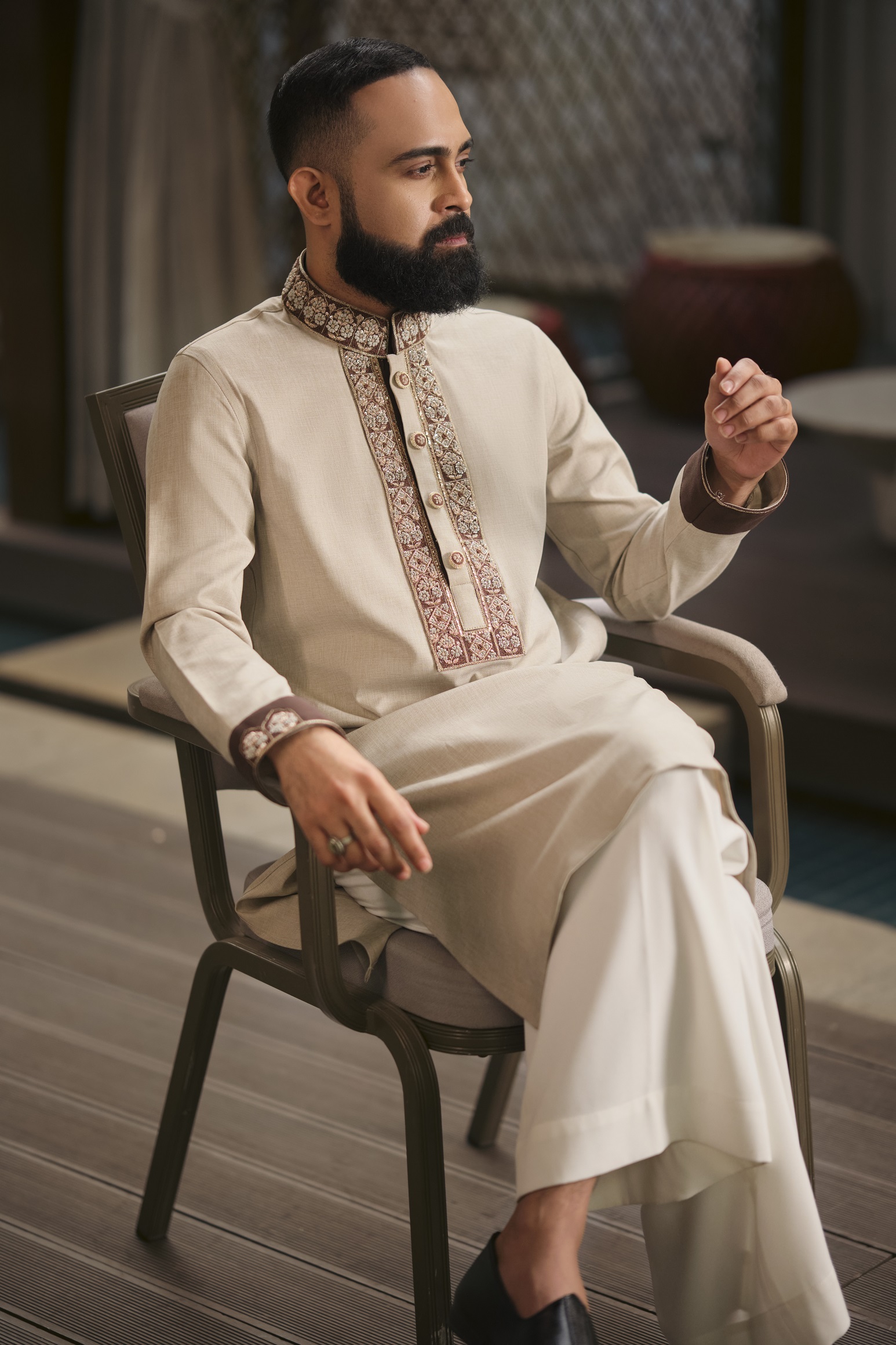Black stripe fabric, all body zardosi floral motif spread, Golden hand work in full collar and sleeve belt, hand crafted button